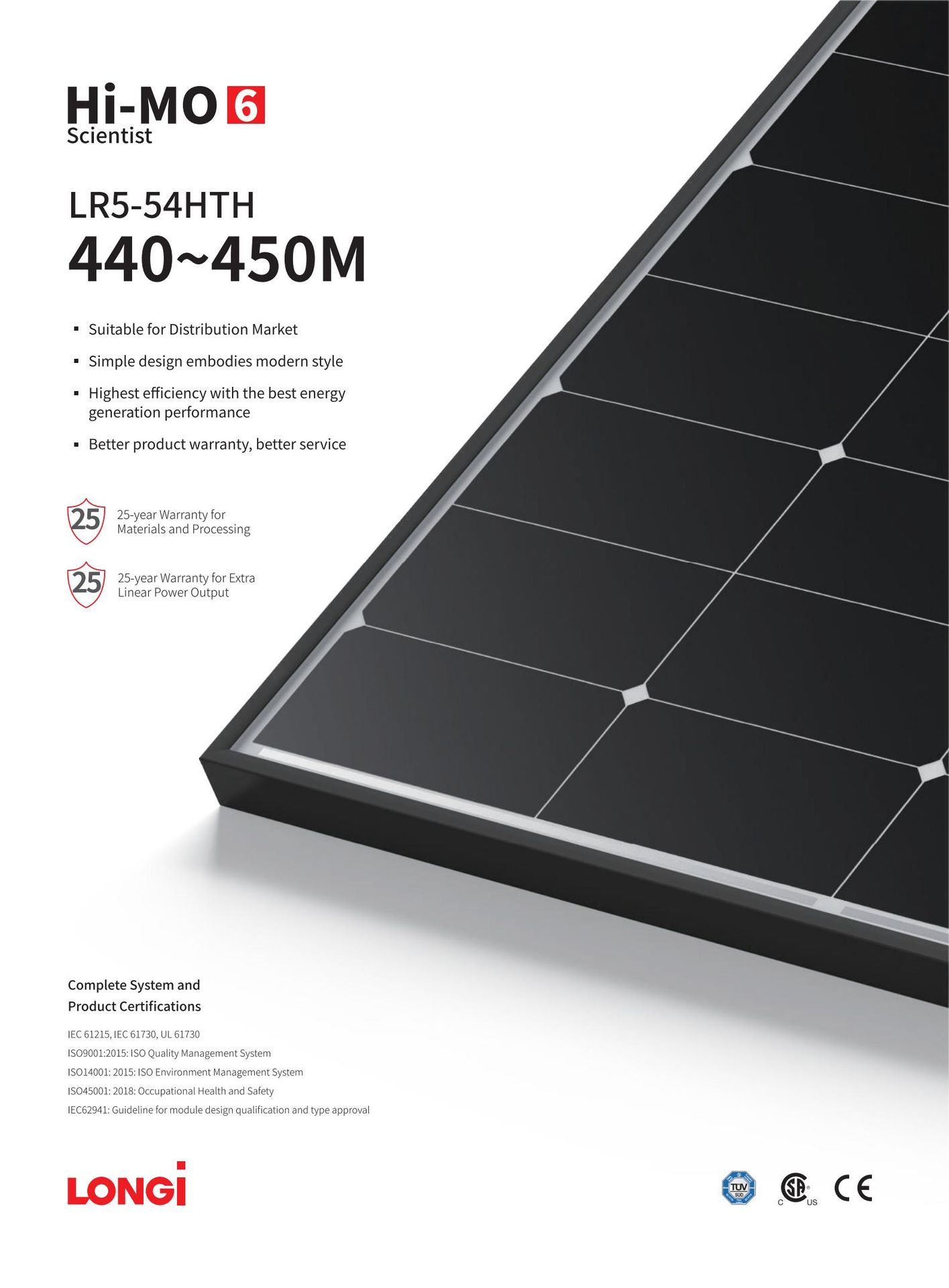 Invest in the Longi LR5-54HTH 440W HPBC Hi-MO6 solar panel for a reliable, efficient, and aesthetically pleasing solar energy solution that meets the highest standards of quality and performance.