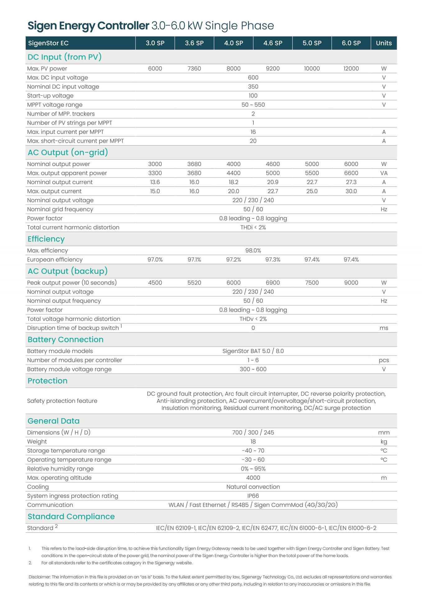 - The SigenStor EC requires at least one SigenStor BAT5 or SigenStor BAT8 for operation